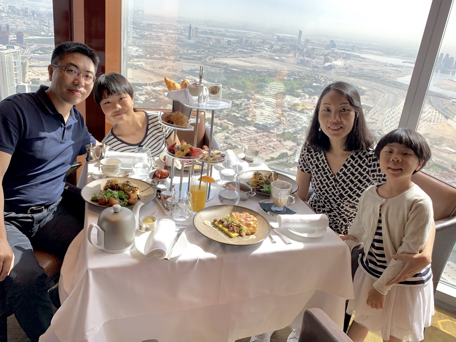 今天正式在迪拜展开我们的行程,非常开心和充实。题图当然要用哈利法塔开心吃早餐的全家福。
